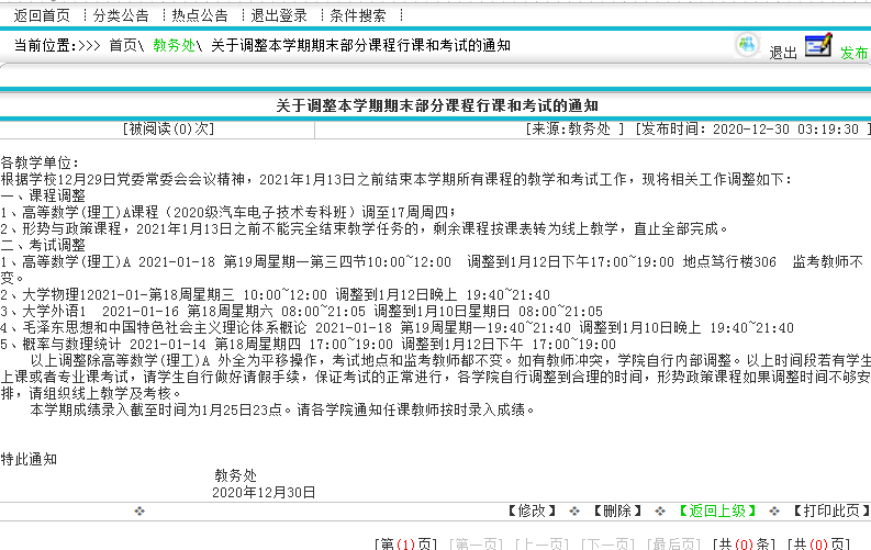 由于疫情影响,放假时间调整,考试时间也进行了部分调动,2020-2021-1学期期末公共课考试安排调整见下图: