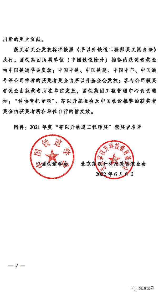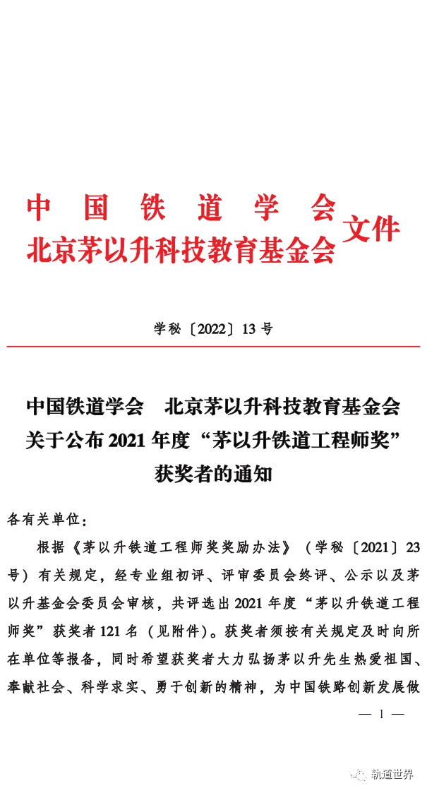 公司员工祁贤荣获2021年度中国铁道学会、中国茅以升科技教育基金会评选的“茅以升铁道工程师奖”。6月8日,中国铁道学会官网和茅以升科技教育基金会公布了2021年度“茅以升铁道工程师奖”评选结果,121名工程师精英获此殊荣。